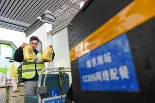 ▲2月7日,在铁路南京南站12306网络配餐中心,送餐员傅秀峰将旅客预订的快餐放入配餐盒。 新华社记者李博摄