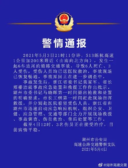 3日21时11分许,S13练杭高速1公里加200米附近(由南向北方向),发生一起6车追尾的道路交通事故,导致6人死亡、3人受伤,受伤人员均已送医院救治,事故现场已恢复畅通。事故原因正在进一步调查中。
