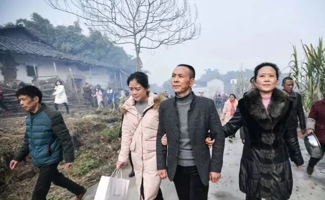 1月21日,在四川泸县方洞镇,杨荣(右二)在妻子和女儿的陪伴下从内江回到泸县“认祖归宗”。