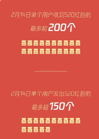 4、腾讯公布微信520红包相关数据 据15日晚数据,上海、北京和深圳情人节当日红包收发量占领前三;14日当天单个用户最多收到超200个红包,单个用户发出红包最多超150个。此外,当天被发出的所有红包里,尚有超123万个未被领取。(腾讯“微信派”账号)