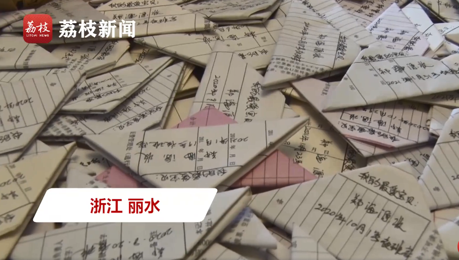 2、民警与妻子28年互写5200多封情书 浙江丽水,53岁的老民警郑海源28年与老婆互相写了5200多封情书。这些情书写在草稿纸、便签、废纸条上,都被折叠成一个个三角形。他们夫妻俩一个是民警一个是高速收费员,聚少离多,这小小的三角情书是两人最深的思念。(荔枝新闻)