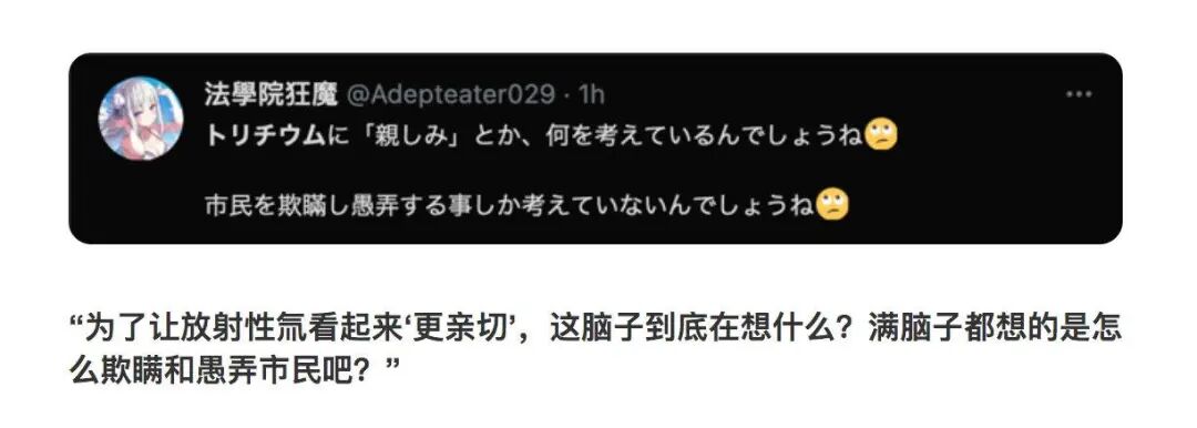 日本复兴厅的负责人表示,将“放射性氚”做成吉祥物,选择这样的方式来表现,是因为这很“平易近人”,“既不是‘善’、也不是‘恶’,而是取其中间这层含义”。