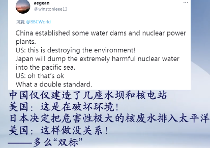 中国仅仅建造了几座水坝和核电站时,美国就说:这是在破坏环境!而日本决定把危害性极大的核废水排入太平洋时,美国却说:这样做没关系——多么“双标”。