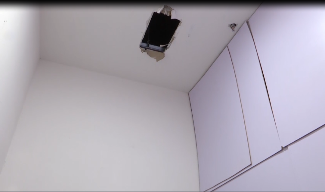 光洁的天花板上,出现一个椭圆形的洞,中间有两根钢筋,周边的粉尘时不时地还会落下来。