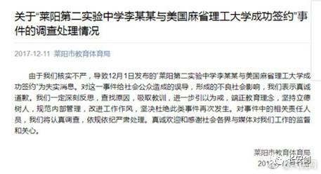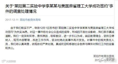 3、官方回应“14岁神童签约麻省理工”:失实消息致歉并将严肃处理。(莱阳市教育体育局网站)