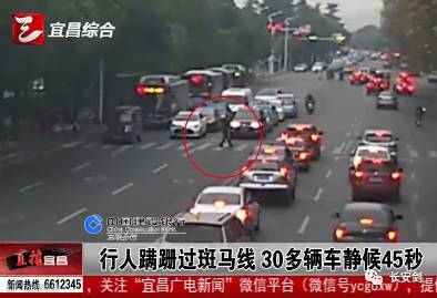 1、一位行人和几十辆汽车 画面像静止一样 近日,湖北宜昌一处没有红绿灯的路口,一位腿脚不便的行人走上斑马线,双向6车道数十辆车先后停下静候,24米,他用了40多秒才走完,此时,画面像静止了一般,两边的车辆就像一道屏障守护他安全通过。(宜昌新闻)