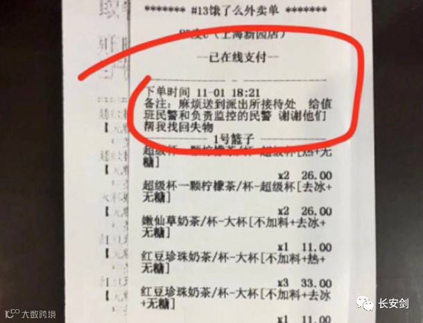 1、外卖单上留言 谢谢找回失物 1日傍晚,上海浦东杨园派出所值班室受理大厅一名外卖送餐小哥手提数杯奶茶,要让民警签收。民警以为送错了,快递小哥递上外卖单,上面写着:“麻烦送到派出所接待处,给值班民警和负责监控的民警,谢谢他们帮我找回失物”。(@中国长安网)