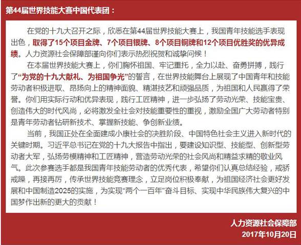 获悉第44届世界技能大赛中国代表团在比赛中取得优异成绩后,人力资源社会保障部已第一时间向中国代表团发出贺电,对中国代表团取得的优异成绩表示热烈祝贺,对代表团全体成员表示诚挚慰问。