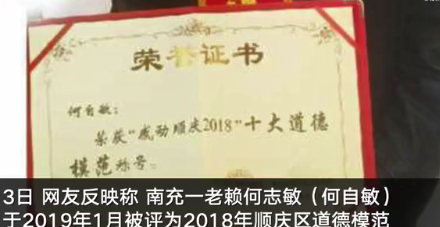 2、官方回应老赖被评区级道德模范 3日,有网友反映称,四川南充一老赖曾被评为当地顺庆区的道德模范。4日当地表示已撤销此人荣誉称号,并收回奖牌和荣誉证书。(@紧急呼叫)