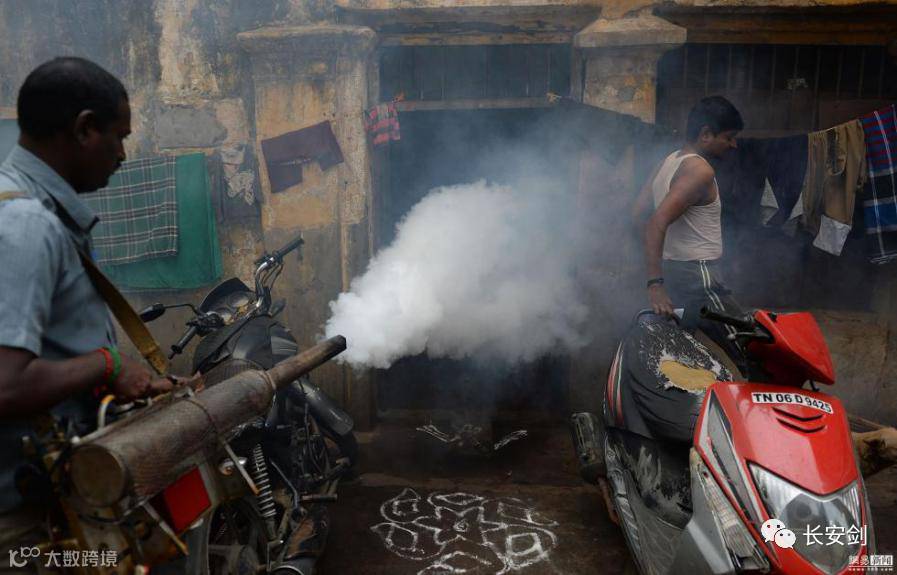 2、印度喷杀虫剂防登革热 民众烟雾中微笑 当地时间12日,印度金奈,市政工人喷洒驱蚊烟雾,以抑制登革热疫情传播。截至7日的一周内,印度首都地区共报告新增登革热病例680例,使得今年报告的登革热病例总数达到4545例,远超去年同期的2711例。(环球网)