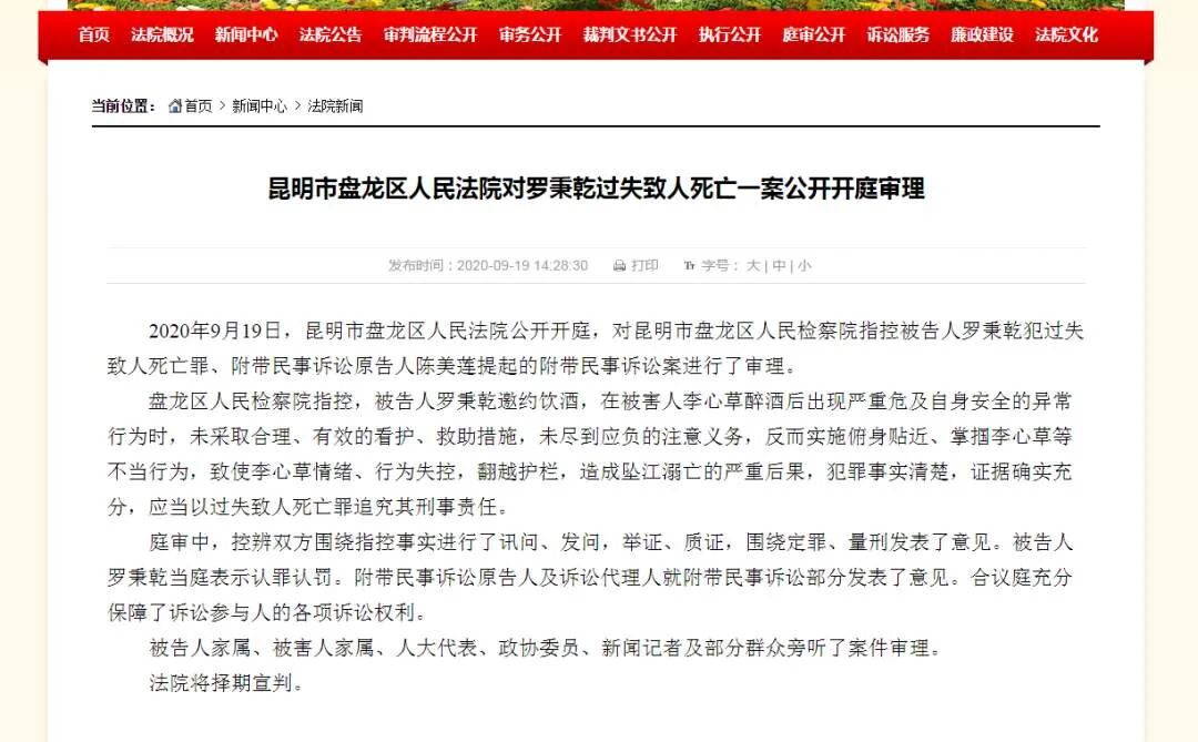 2020年9月19日,昆明市盘龙区人民法院公开开庭,对昆明市盘龙区人民检察院指控被告人罗秉乾犯过失致人死亡罪、附带民事诉讼原告人陈美莲提起的附带民事诉讼案进行了审理。