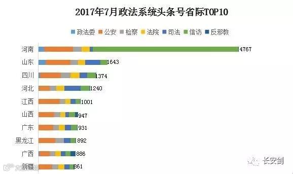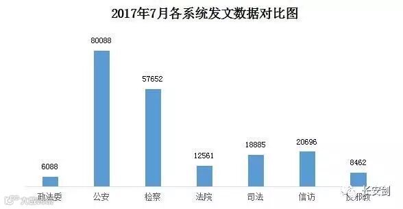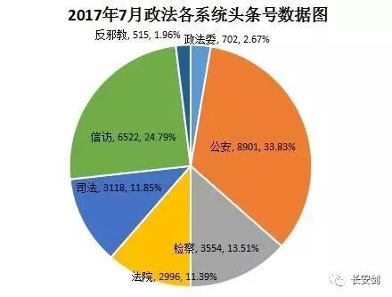 本榜单统计了政法系统内政法委、公安、检察、法院、司法、信访和反邪教7大系统头条号7月份数据。政法系统发文头条号为8,668个,较上月增加了125个头条号,环比上升1.46%。发文总数为204,432篇,较上月增加了19,409篇,环比上升10.49%,各系统数据如下图: