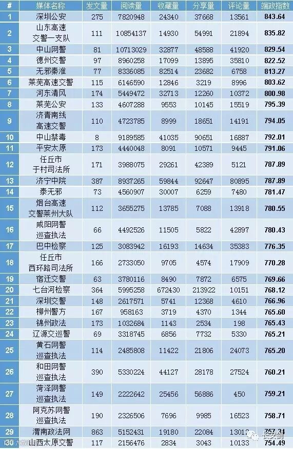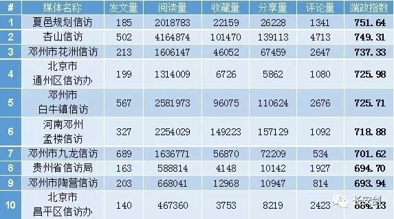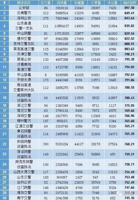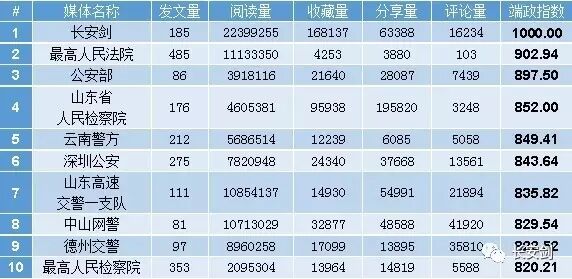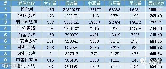 端政指数:“端政指数”是综合考量单个政务头条号运营情况的指数。1、综合考量单个政务头条号的发文量、阅读量、收藏量、分享量、评论量等指标;2、综合考虑平均阅读量、平均收藏转发量、文章原创度等指标;3、所有指标进行综合计算后得出的数值即是“端政指数”,可以客观反映每个政务头条号在某段时间内的整体传播影响力;4、2017年为打击抄袭,鼓励原创,“端政指数”提高了文章原创度所占比重,并对当月被举报的头条号处以端政指数罚分处理。每月排名第一的政务头条号的分值设为1000,其他账号依实际分值比例顺次排列。