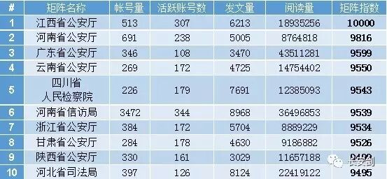 矩阵指数:“矩阵指数”是对某个区域内、某个行业头条号组成的头条号矩阵进行综合考量的指数。1、综合考量矩阵内帐号量、活跃度、发文量、阅读量等指标;2、参考矩阵内帐号平均发文量、平均阅读量,文章原创度等指标;3、所有指标进行综合计算后得出的数值即是“矩阵指数”,可以客观反映政务头条号矩阵在某段时间内矩阵组织能力和整体传播影响力;4、2017年为打击抄袭,鼓励原创,“端政指数”提高了文章原创度所占比重。每月排名第一的省级政务头条号矩阵分值设为10000,排名第一的地市级矩阵分值设为5000,同级其他头条号矩阵依实际分值比例顺次排列。