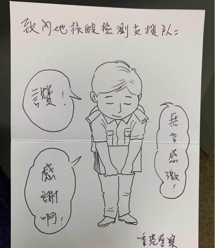 雪片般的祝福飞向内地医疗队,让无数颗真诚的心紧紧相连。有警宝看到爸爸在写后,也亲手画出了祝福。