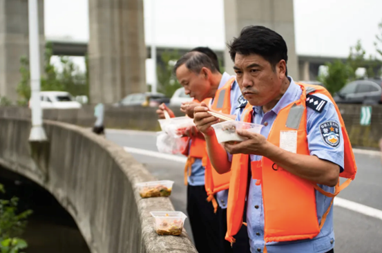 7月14日,湖北武汉天兴洲大桥匝道口,一顶蓝色帐篷前,几个蓝色身影依旧格外亮眼,他们就是来自天兴乡派出所的民警和辅警。