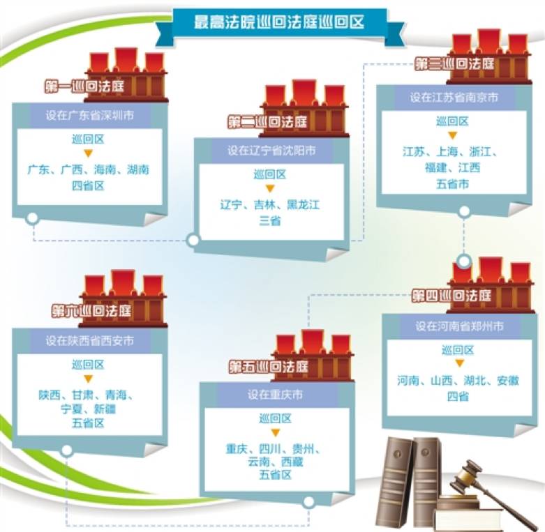 目前,我国华东、华中、华南、西北、西南、东北六大分区,每个分区都拥有一个巡回法庭。全面推行新的审判权运行机制,“让审理者裁判,由裁判者负责”,落实法官员额制和司法人员分类管理,法官、法官助理、书记员分工协作,没有固定合议庭,不设审批“门槛”。