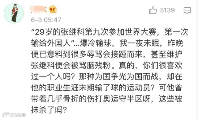 6月3日凌晨,世乒赛男单第三轮比赛中,中国选手张继科1:4不敌韩国选手李尚洙,无缘男单16强,爆出本届赛事开赛以来的最大冷门。