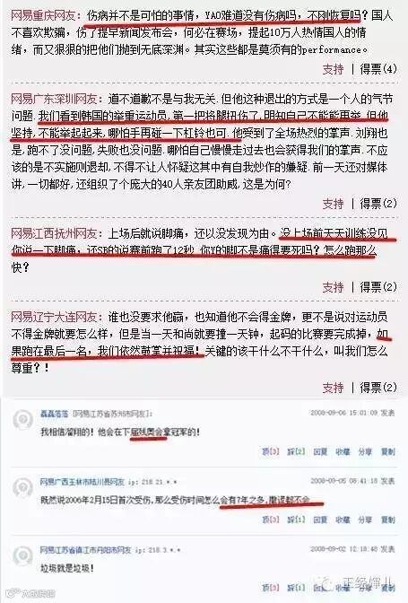 刘翔退赛后,网民对他的谩骂犹如恶浪滔天:“刘跑跑”、“刘退退”...,那个前两天还在为“八国联军火烧圆明园”洗地的门户网站,当时还发起投票,摁着脖子让退赛的刘翔道歉。