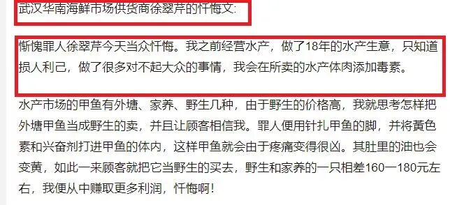 今年2月,该团伙看到一篇题为“惭愧罪人徐翠芹今天当众忏悔”的旧帖,内容为某水产市场内部经营乱象,遂想到将该帖与华南海鲜市场联系起来“蹭热点”,于是将帖文内容改为“华南海鲜市场供货商徐翠芹”,又套上《华南海鲜市场供货商的忏悔书!曝光巨大黑幕!》的标题,炮制出造谣帖文后即在微信公众号发布。
