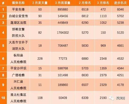 观榜指南:影响力进步榜上榜头条号单月发文量至少在6篇以上且开通时间不少于两个月。对达到上述要求的头条号,再根据其本月与上月端政指数排名增幅情况进行排序。此处排名是指该头条号在37000余个头条号中的排名,不是该头条号在20000余个政法头条号中的排名。