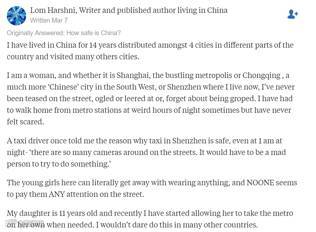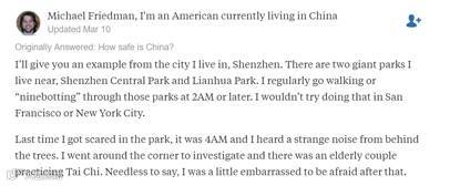 一位网名叫David Riordan的Quora用户这样写道,“我在北京和沈阳住了快两年。之前我还曾在爱尔兰、德国和美国都生活过。至少到目前为止,我觉得中国是最安全的国家。我没法从女性的角度说太多,但作为男人,我可以说在中国我只有唯一一次看见过有人处于危险之中:那是一个人喝得烂醉,当时他对周围的中国人和我们老外都构成了威胁。”这条短短的帖子获得了超过100万阅读量和1500多个“赞”。