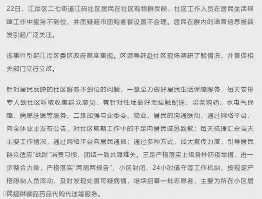 此外,针对该女子视频反映问题,武汉市江岸区回应:事件发生后,引起了江岸区委区政府高度重视,区领导赶赴社区现场调研了解情况,并督促相关部门立行立改。