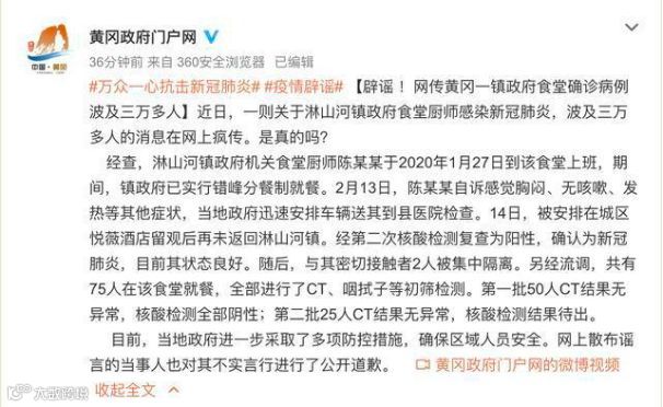 近日,网上传言称:湖北黄岗一厨师感染新冠肺炎,波及三万多人。
