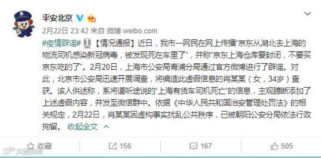近日,北京市一网民在网上传播“京东从湖北去上海的物流司机感染新冠病毒,被发现死在车里了”,并称“京东上海仓库要封闭,不要买京东吃的了”。