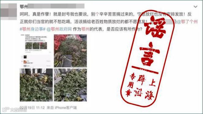 近日,网上出现传言称,“贵州捐给湖北鄂州的蔬菜大批大批烂在仓库”“宁愿放烂也没有安排发放”。