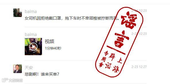 23日,网络传言称:一女司机因拒带口罩被执法者拖下车时拧断颈椎而亡。