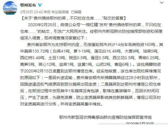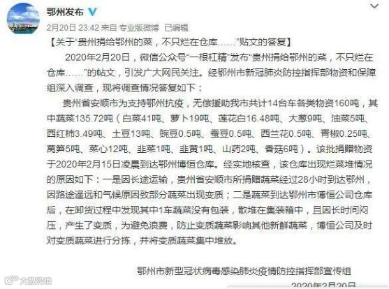 20日,鄂州疫情指挥部公布了此事的调查结果。回应称,贵州捐赠已15日到达鄂州博恒仓库,新鲜蔬菜部分已配发。