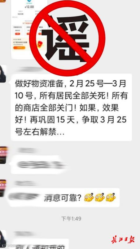 23日,网上传言称:“2月25日至3月10日期间,湖北武汉所有居民全部关死(指不许出门),所有商店全部关门!如果效果好,再巩固15天,争取3月25号左右解禁……”