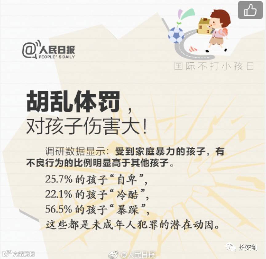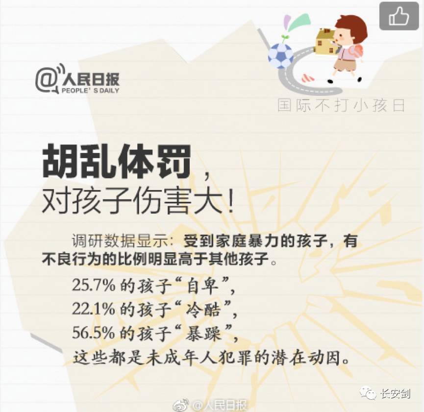 6、【国际不打小孩日:打过和被打过的,请转发支持!】调查显示,我国有69.8%的人在小学阶段受过体罚。体罚不是小事。打屁股、扇耳光、拧耳朵,你的随手动作带来的伤害,有些不可逆,有些甚至致命。今天,国际不打小孩日,请学会倾听,用宽容和耐心陪伴孩子成长。向体罚说“不”,支持请转!(@人民日报)