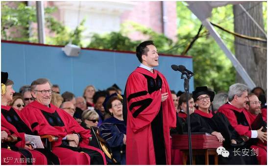 (图:2016年5月26日,哈佛大学第365届毕业典礼在 Harvard Yard 隆重举行,何江博士作为毕业生代表致辞,成为登上这个讲台的第一位中国学生。)