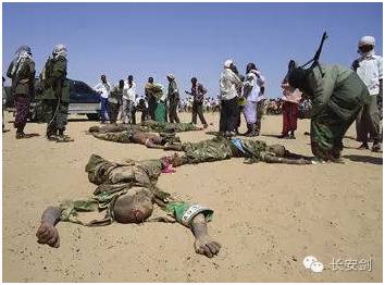 (图:索马里青年党武装人员在拖拽一名阵亡的政府士兵)
