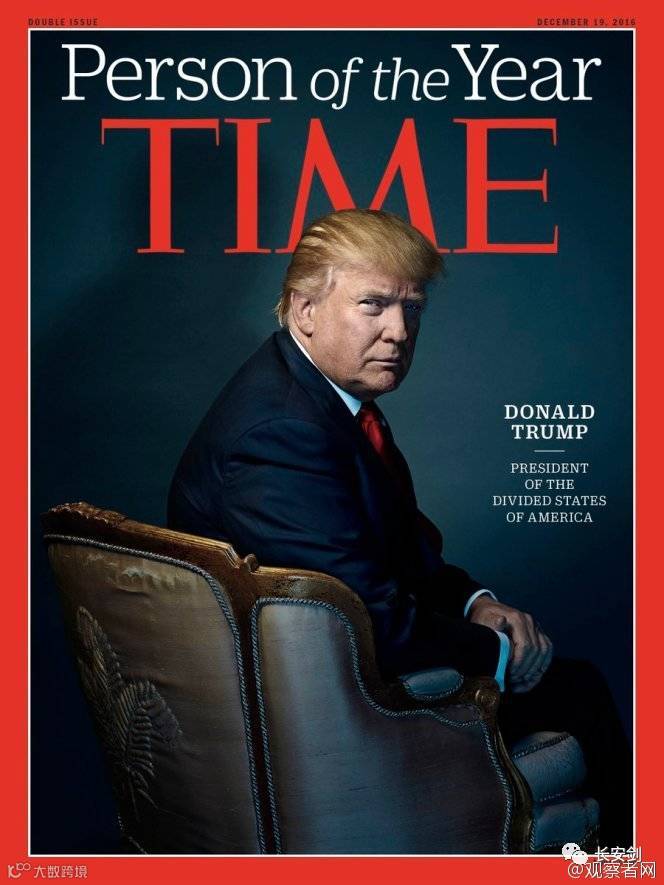 3、特朗普当选《时代》杂志年度人物:美利坚分裂国总统 12月7日,美国《时代周刊》揭晓了“2016年度人物”,即将上任美国总统的唐纳德•特朗普成功当选。《时代》将特朗普印在杂志封面,并配以文字“美利坚分裂国总统”(President of the Divided States of America)。《时代》称,特朗普并没有描绘一幅光明前景,而是扩大了分裂局势,激发了全国的愤怒和恐惧。(观察者网)