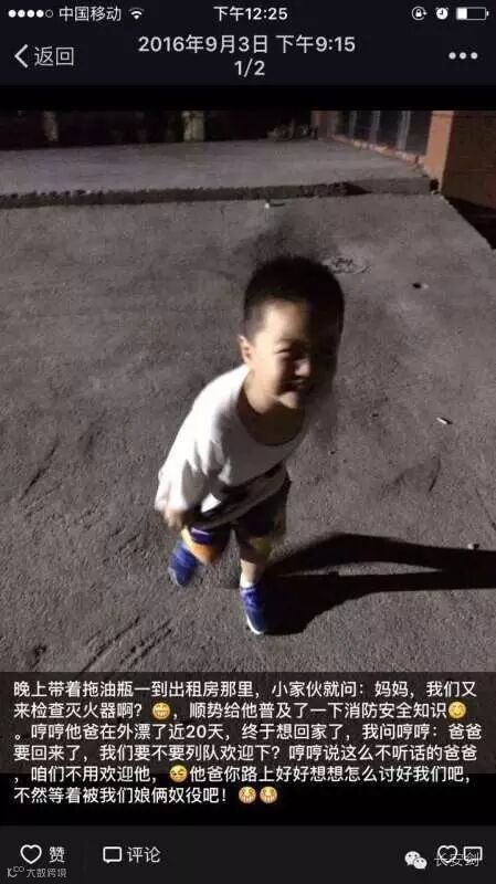 作为另一半,我理解你的工作,可是孩子的成长需要父亲的陪伴。你陪儿子的时间真的太少了。你每次出差在外,儿子都很少提到你,很少主动给你打电话,我不知道你有没有感觉到。反正感情需要时间和有效陪伴来积累的,我也希望儿子像依赖我一样的依赖你。你每次都说让我再等等,等你有时间了,就带着我们娘俩去旅行,可每次都食言。今年4月我只好一个人带着他远游了一次,一个人拖着一个行李箱,牵着他,赶完火车赶飞机,赶完飞机赶大巴,其实我心里也很忐忑,第一次一个人带着他走那么远,要是有你在的话,我只要照看好他就行了。一切顺利,开开心心出去,安安全全回来,把承诺给兑现了。