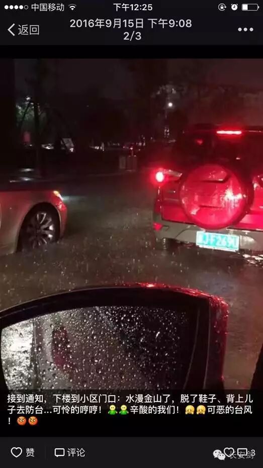 今年的9月15日晚上,你接到通知就去紫砂岙抗台抢险了,留下我和儿子在家。可是没过半小时,我也接到通知要去单位抗台。无奈给儿子穿上雨衣,自己脱了鞋子,背着儿子淌着浑水去找出租车。可是你知道的我们小区四周地势低洼,根本打不到出租车,只好自己硬着头皮开着咱们的小骐达游着去单位(心里默念着,不要熄火不要熄火),万一路上出点状况可怎么办呀?我不敢想象……那会儿感觉好辛酸!
