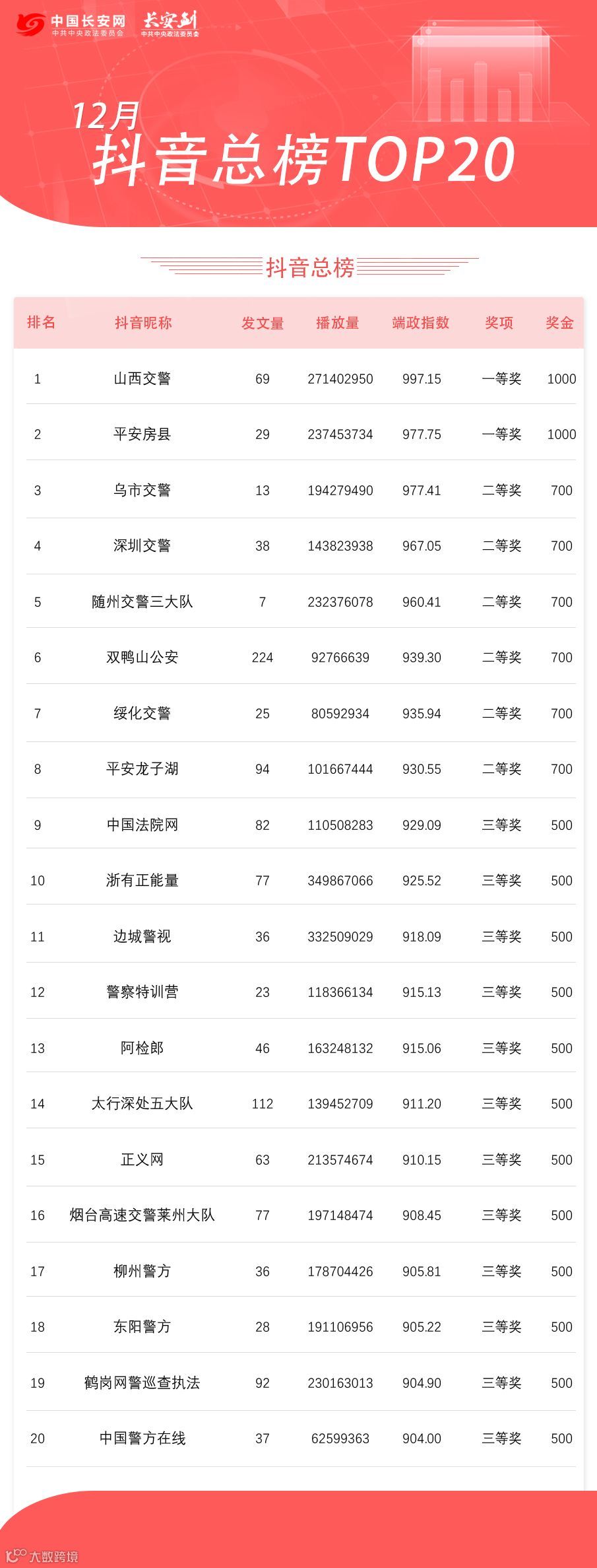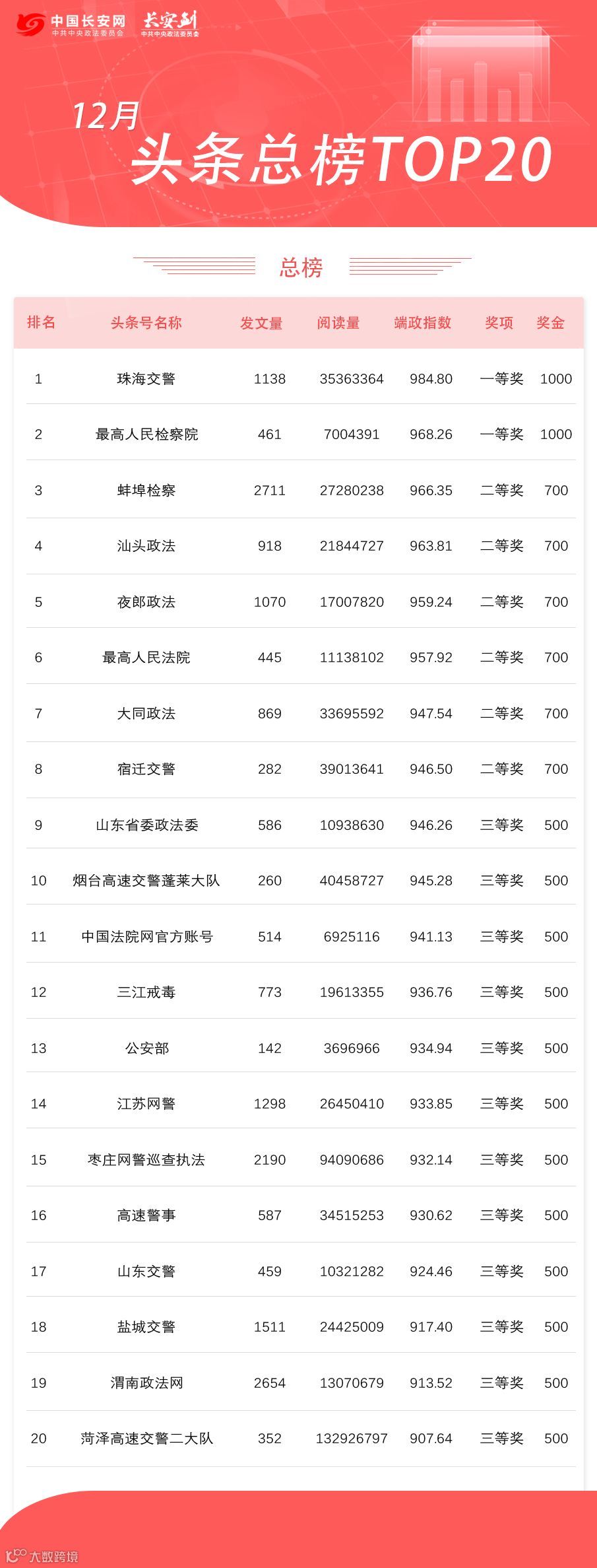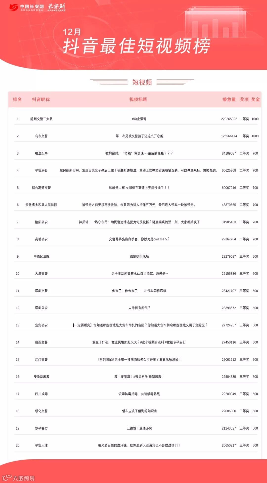 同一家单位可入选多个榜单,如果可入选两个以上榜单,则保留排名最高的两个榜单发布奖金。其中头条号、抖音号单独统计,同一家单位最多可获得四份奖金;最佳文章榜、最佳短视频榜内各自都不出现重复的单位,同一家单位可同时入选以上两个榜单。