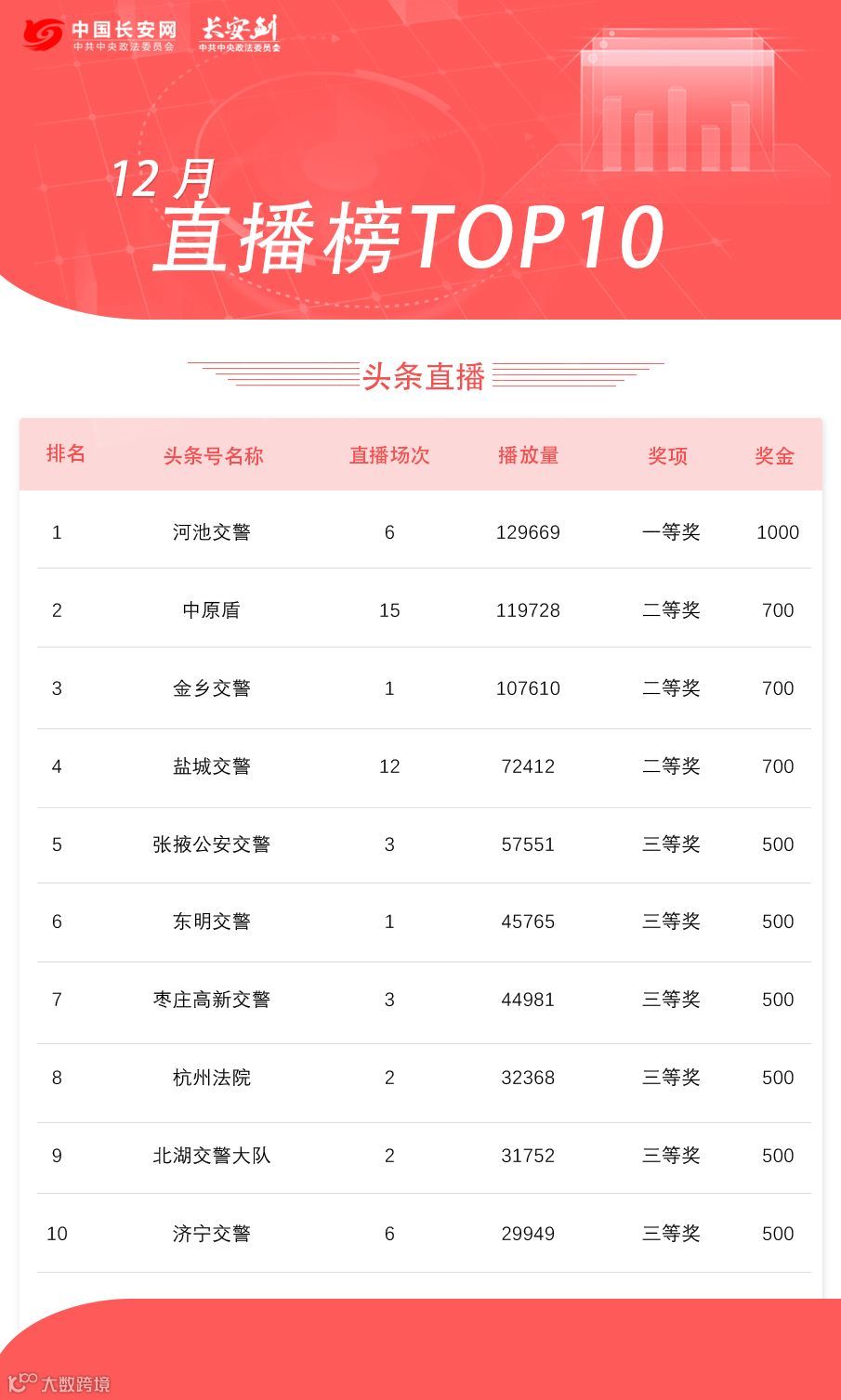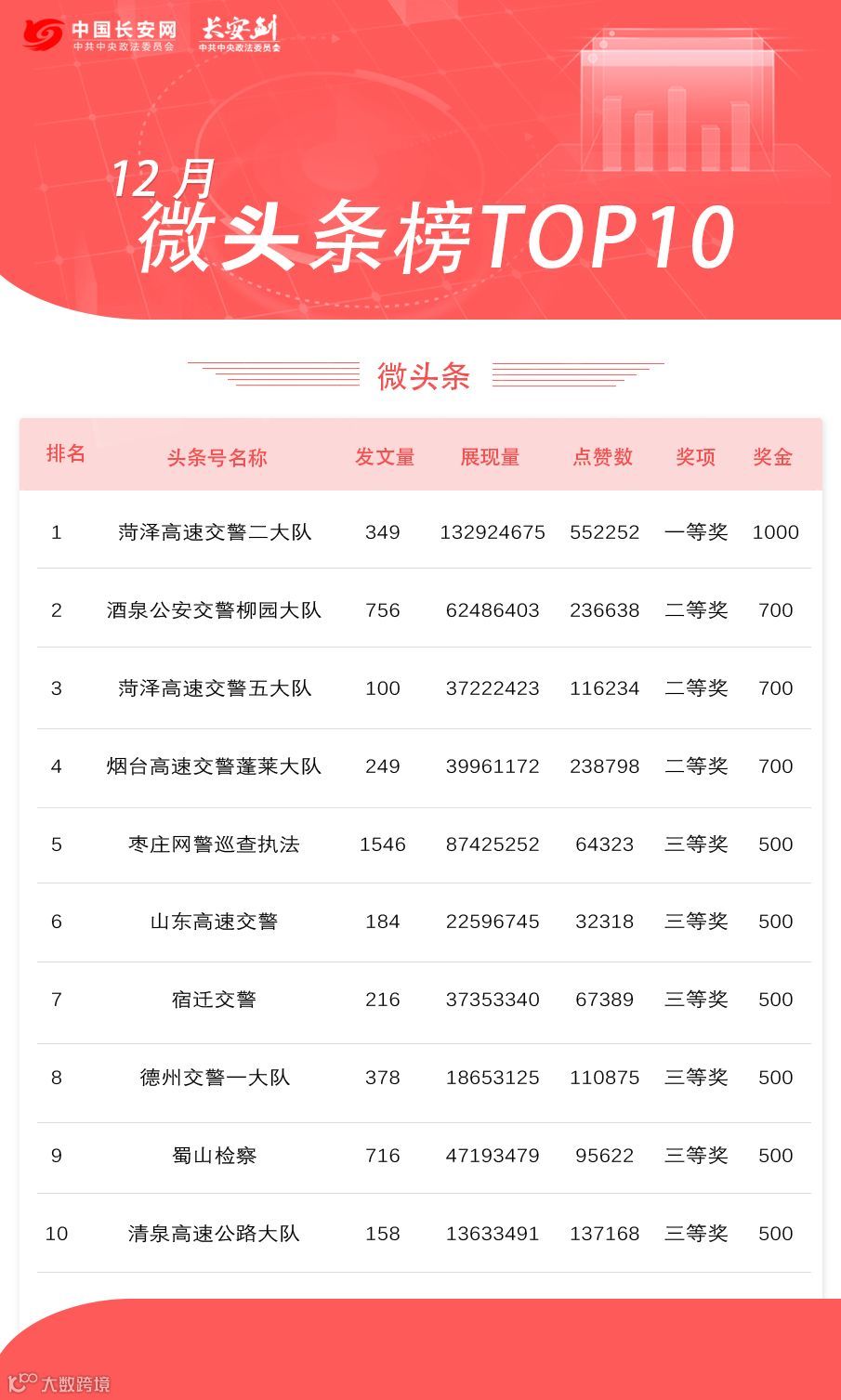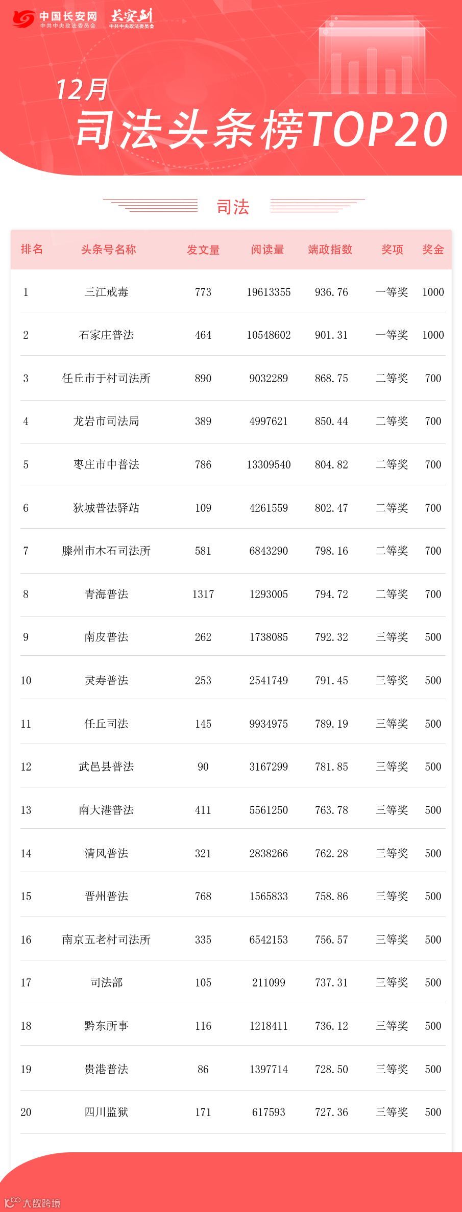 同一家单位可入选多个榜单,如果可入选两个以上榜单,则保留排名最高的两个榜单发布奖金。其中头条号、抖音号单独统计,同一家单位最多可获得四份奖金;最佳文章榜、最佳短视频榜内各自都不出现重复的单位,同一家单位可同时入选以上两个榜单。