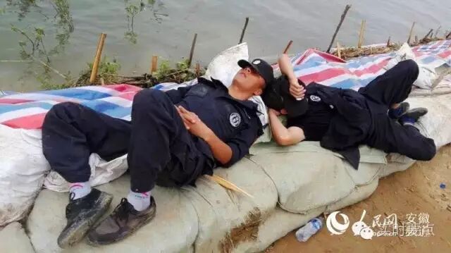 2016年7月10日,广西池州市公安局贵池分局民警在新丰圩大堤抢险救灾。经过连夜战斗,民警们疲惫不堪,躺在加固堤坝的砂石袋上睡着了,而他们的身旁就是滚滚洪水。
