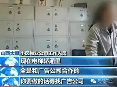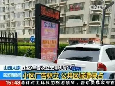 无独有偶,在山西太原的一个小区,物业公司通过收取入场费的方式将小区里的广告卖出去,挡车杆上的房地产广告、社区灯箱上旅游公司的广告,社区饮水机、不到四平米的电梯间里都挂上了广告,内容包括了商店促销、健身以及理财信息等。此外,还有滚屏灯箱、多媒体电视广告等。