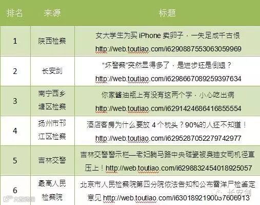 全国政法系统头条号热门文章阅读量TOP10(2016年6月)