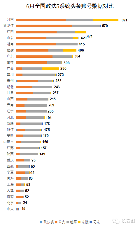 按照省份划分,政法各家的账号数看这里(恭喜河南、黑龙江、江西喔)——