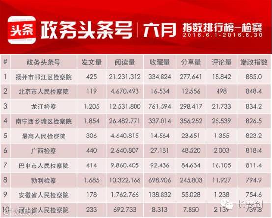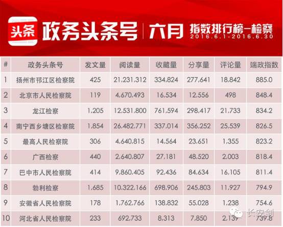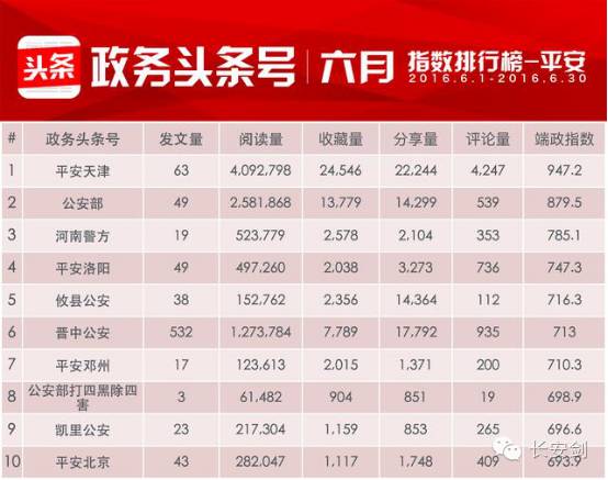 (本榜单依据为2016年6月1日-6月30日间,由每个头条号发文量、阅读量、收藏量、分享量、评论量等指标综合测算出的“端政指数”,指数最大值为1000,可以客观反映每个政务头条号在某段时间的整体运营质量。)
