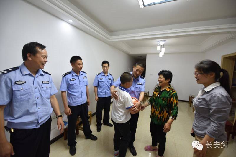 图中左一为龙王派出所教导员冯海林,左二为副所长宋小伟,右一为李军妻子汪金平,右二为李军母亲谢贵芝,图中为所长陶军与小俊拥抱告别 张伟 摄