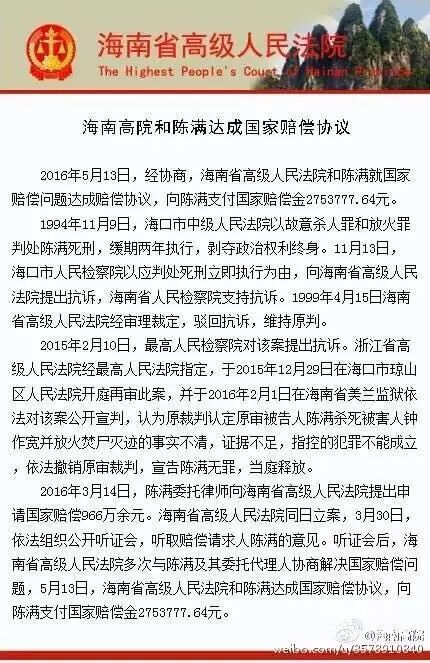 2016年3月14日,陈满委托律师向海南省高级人民法院提出申请国家赔偿966万余元。海南省高级人民法院同日立案,3月30日,依法组织公开听证会,听取赔偿请求人陈满的意见。听证会后,海南省高级人民法院多次与陈满及其委托代理人协商解决国家赔偿问题,5月13日,海南省高级人民法院和陈满达成国家赔偿协议,向陈满支付国家赔偿金2753777.64元。