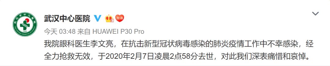 据@武汉中心医院 消息:武汉中心医院眼科医生李文亮,在抗击新型冠状病毒感染的肺炎疫情工作中不幸感染,经全力抢救无效,