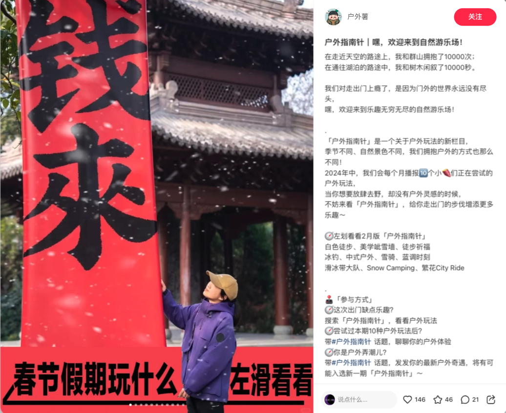 发布全新户外奇遇,将有可能入选新一期「户外指南针」,让更多小红薯看到你的户外灵感
